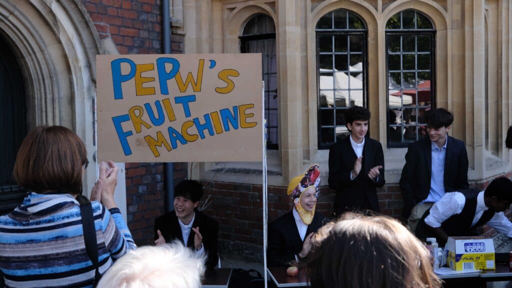 As always, each Boarding House set up their own stall which was run by boys from Year 9 to 11, providing healthy competition to raise extra money. Among the favourites were Evans’ bubble tea stall and Manor House’s ‘Human Fruit Machine’, with College’s ‘Soak the KS’ providing entertainment for students. Younger children were able to enjoy a slide, bouncy castle and swings procured by Godolphin, Keats and Holland House respectively. Attendees of all ages were entertained by groups from Maidenhead and Windsor Rock choirs as well as four performances from Eton Porny C of E First School—an aspect which will be expanded in future years.