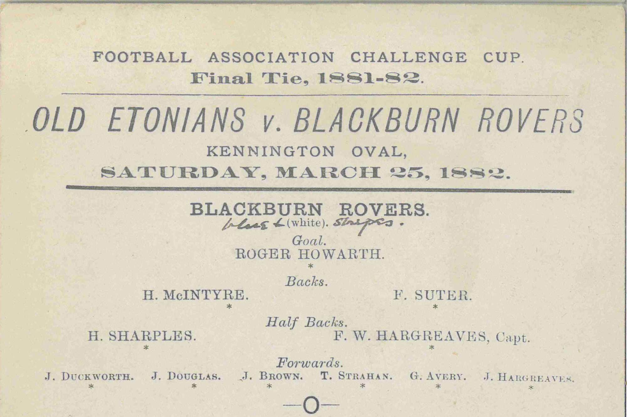 Almost 110 years after the 1882 triumph, a dinner was held at Eton College to commemorate this history writing victory and the long-standing relationship between Blackburn and the College. Much of Eton’s history in football can be explored in the College Archives, where memorabilia including match day programmes and rulebooks are found.