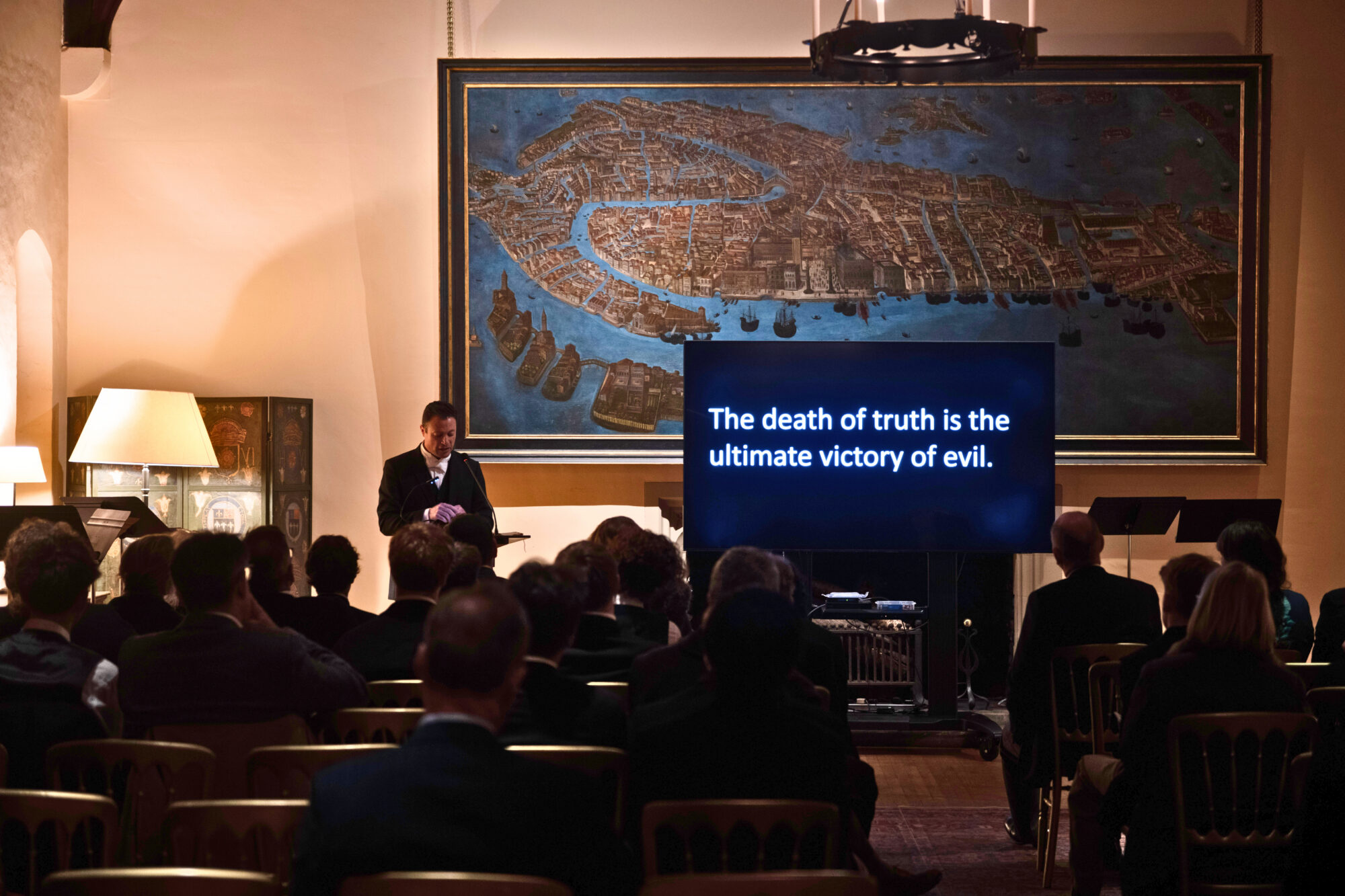 The choice of venue was especially apt. Speakers addressed the Holocaust beneath Odoardo Fialetti’s View of Venice (1611), depicting the site of the world’s first segregated Jewish ghetto. The setting drew a clear visual link between the institutionalisation of race-based exclusion and its eventual, murderous end.