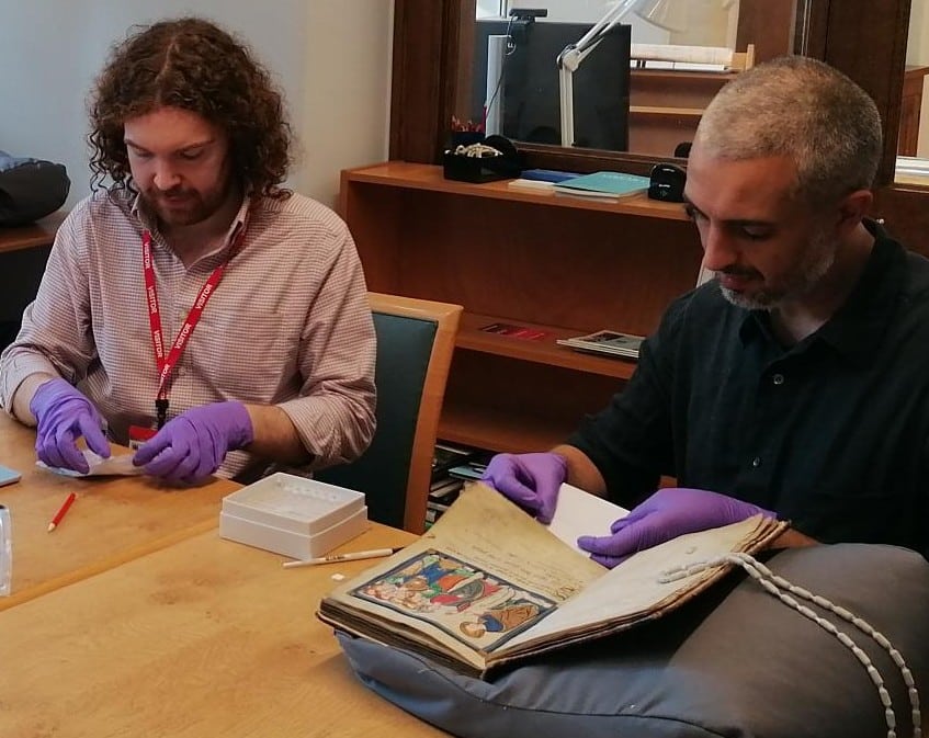Over the summer a non-destructive ‘bio-codicological’ analysis was conducted on College Library’s MS 177 as part of the University of Exeter’s project Learning Anglo French. The proteomic and genetic analysis will shed light on what animal species were used for the manuscript’s manufacture and where they may have come from. At the same time the study will recover any historic human DNA present and map chromosomal frequencies to understand whether the readers were mainly women or men, as well as gather information on profiles of any bacteria and viruses present, such as human acne or sheep-pox. Stay tuned!